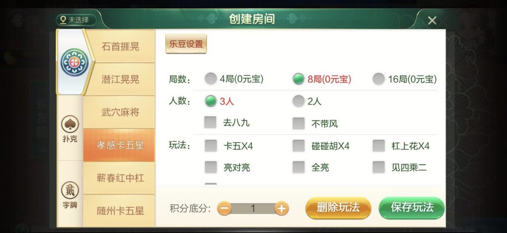 麻将:洪泽推到胡、一脚赖油、干瞪眼、宜昌血流成河麻将、恩施麻将(一痞二癞)、靖州麻将、京山麻将、崇阳麻将、通城麻将、大冶开口番、戳虾子、阳新麻将、红中癞子杠、黄石晃晃麻将、通山晃晃麻将、江陵红中、蕲春晃晃、蕲春广东麻将、公安花牌、石首捱晃麻将、潜江晃晃麻将、武穴麻将、孝感卡五星麻将、蕲春红中杠、随州卡五星。