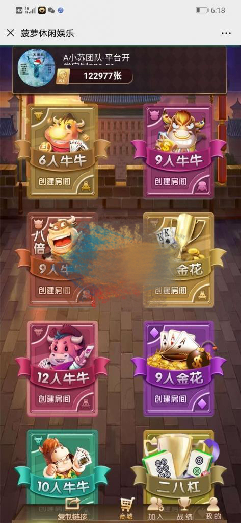 游戏:12人牛牛、9人牛牛、6人牛牛、12人三张、6人三张、二八杠,牌九,三公,鱼虾蟹,扎金花等等