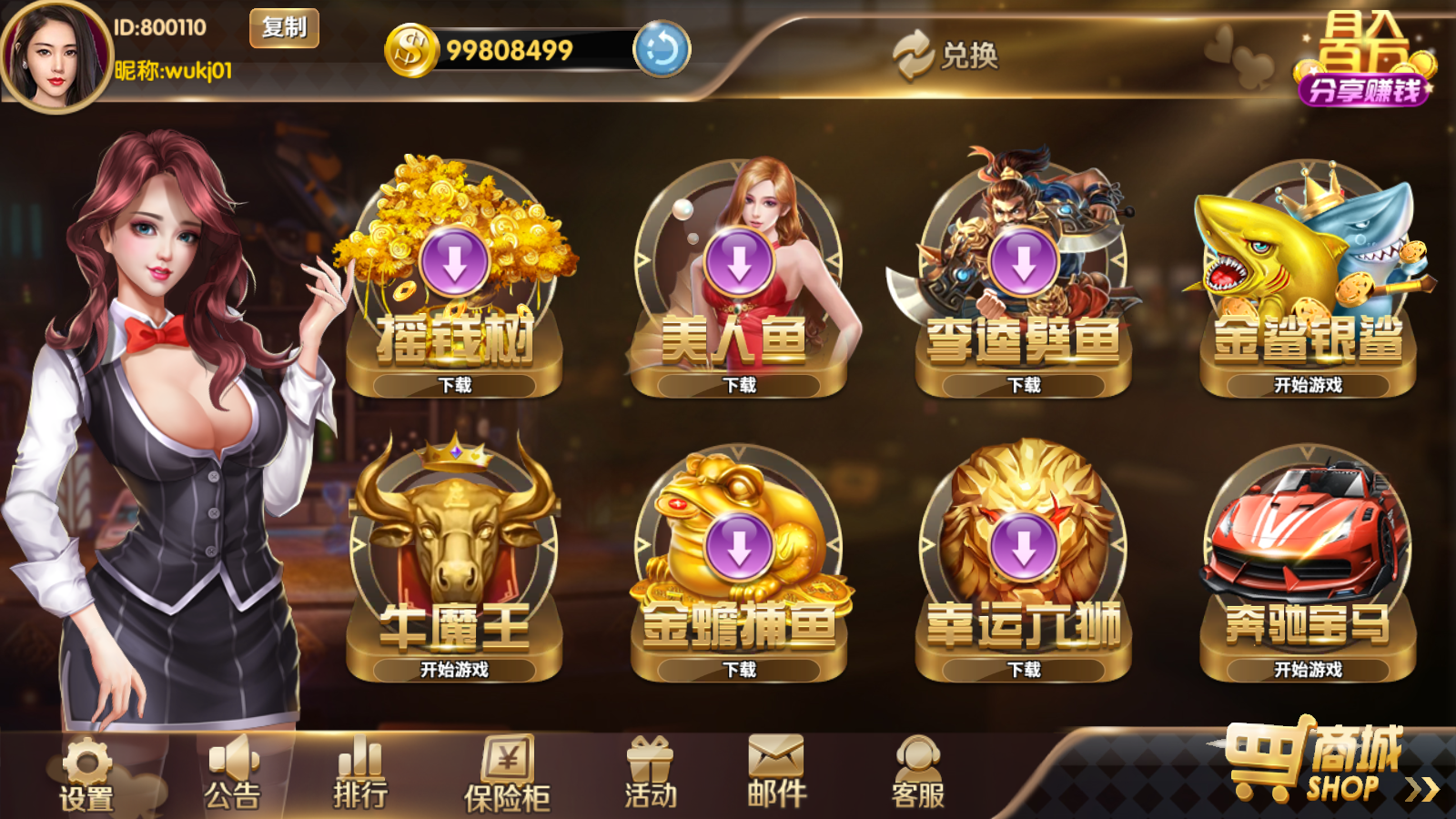 子游戏:摇钱树,金蟾捕鱼,李逵劈鱼,单挑,牛魔王,美人鱼,渔乐无穷,幸运六狮,单挑(ATT连环炮)金鲨银鲨,空战英豪,火凤凰,神龙宝藏,奔驰宝马,史前巨鳄,金皇冠,八爪鱼。